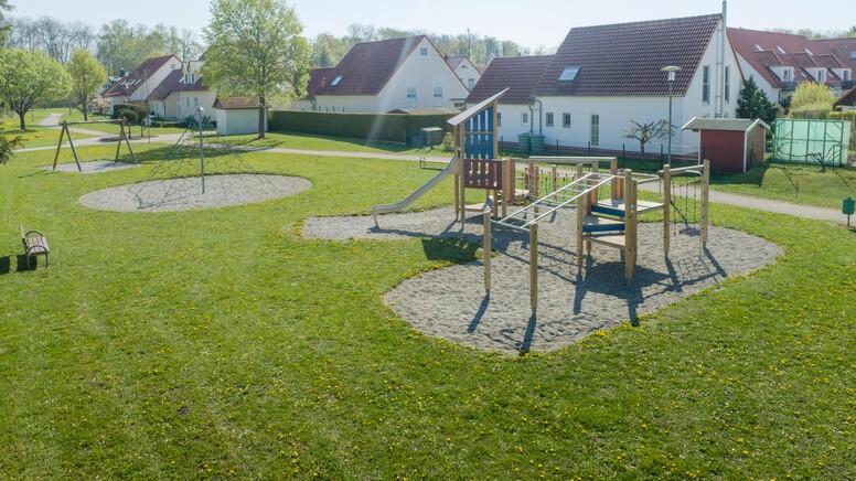 Der Spielplatz verfügt über eine Schaukel und verschiedene Klettergerüste zum Teil mit einer Rutsche. Hier können Ihre kleinen Spaß auf dem Spielplatz haben!