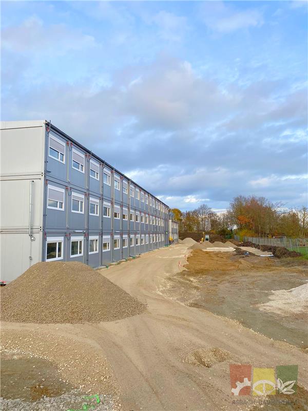 Für die Dauer des Neubaus der Grund- und Mittelschule Asbach-Bäumenheim wurde die Interimsschule der Realschule Rain übernommen. Seit September 2025 stehen am Josef-Dunau-Ring 8 insgesamt 180 Container auf drei Etagen bereit.